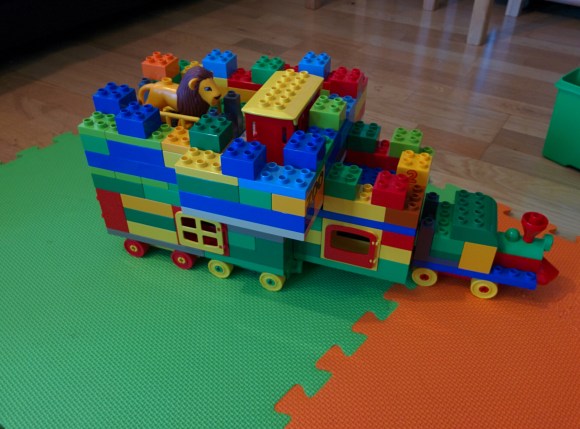 Today I left the boys at home for nap time while I went out to enjoy a girly lunch with my visiting friend. We came back to find the two of them on the floor of the living room with this creation: A mobile castle for The Lion King that is made up of four interlocking smaller vehicles that can come apart or be put together into one giant Mad Max-esque moving fortress. Since a large part of our Duplo comes from a zoo set animals frequently feature in our current creations. We have probably constructed and reconstructed many possible wheeled version of Noah’s ark in the last year.