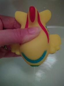 “You hold the airplane under the water. No, under the water. And now you squeeze, squeeze, squeeze and then let it fill up… no, keep it under the water otherwise it just has air and can’t squirt. Let’s try this again. Hold the airplane under the water and squeeeeeeze, now keep holding it under the water…. keep holding it…. let it fill up. Ok! Now you squeeze and- NO! Squeeze it out of the water now! Ok, one more time – hold it under the water, squeeze squeeze squeeeeeze… let it fill up under the water. Under the water. Now take it out of the water and squeeze and YES! See, now it squirts water and I’m going to regret teaching you how to do this very shortly.”