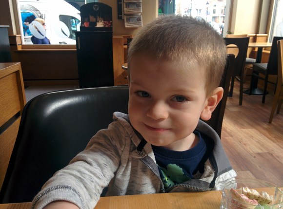 He agrees to try a spoon so I give him a taste. He eats the spoonful of yogurt and then very carefully, with great concentration, chews the granola as his eyebrows slowly draw together into a rather sour frown. He doesn’t do any of the toddler things that are possible – he doesn’t spit it out, stick his tongue out and let the yogurt dribble down, cry, yell or get upset. He just continues to chew with steely determination to get through the experience and return to his biscuits.