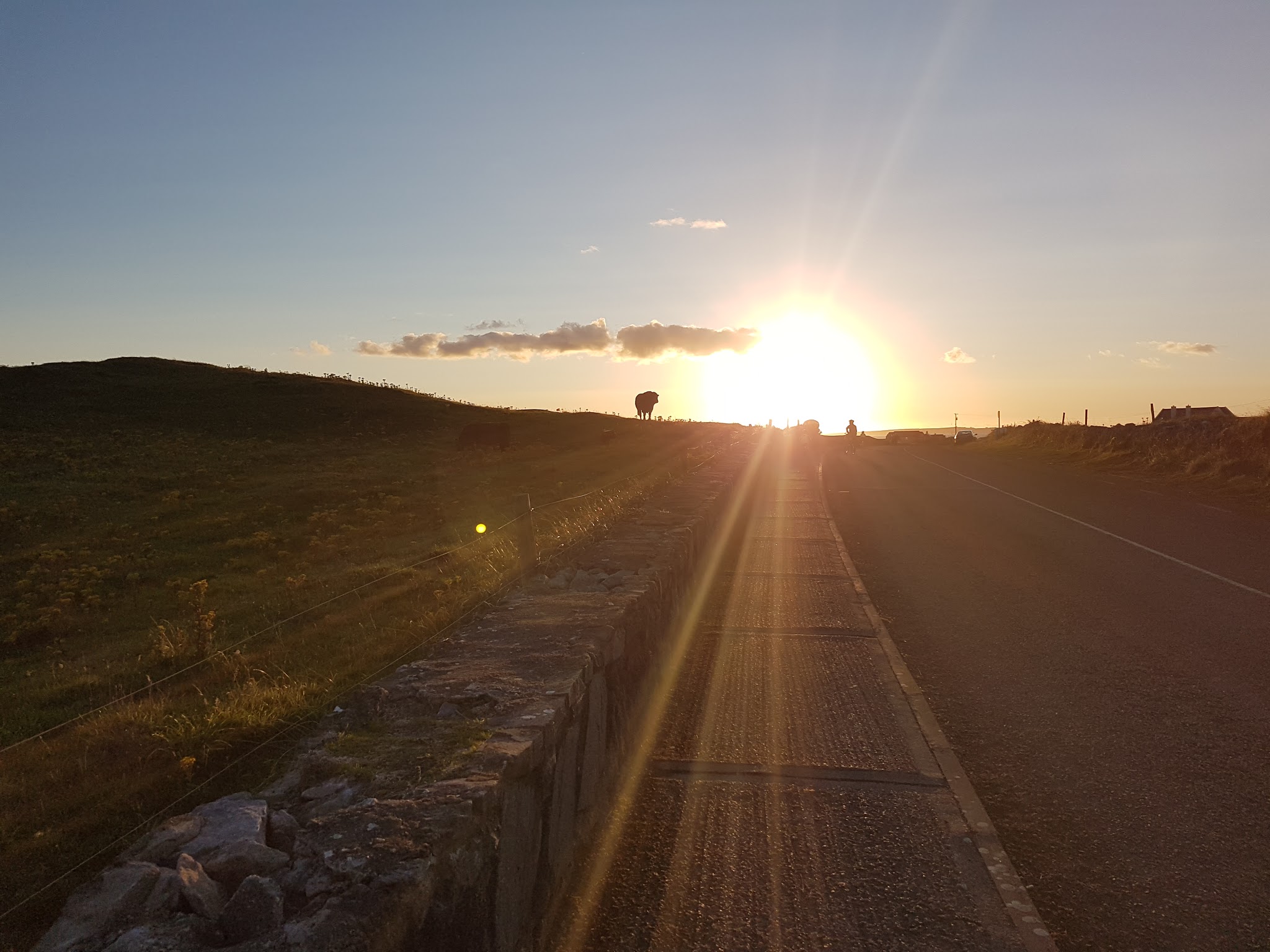 It’s amazing the difference that sunshine can make to a place. Monday was a bit of a mixed bag but yesterday was gloriously sunny, despite a few patches of rain. Instead of windswept desolation there was an endless expanse of deep blue sky and verdant green farmland. Instead of a dark echo of the past, the crisscrossing old stone walls and dotted ruins brought quaint sense of whimsy to the landscape.