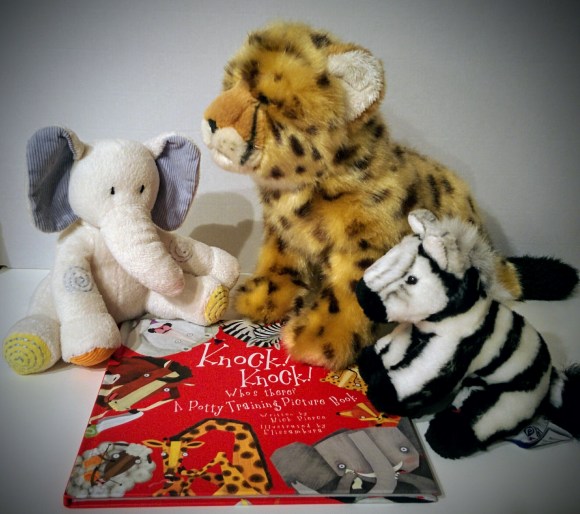 We stop by the library every few weeks to try new books, and the last time I was there I picked up this volume in the hopes of it being helpful to our current endeavour. It’s called Knock! Knock! Who’s there? A Potty Training Picture Book written by Nick Pierce and illustrated by Elissambura. Our habit with this book, whenever Hawkeye insists on us reading it, has become that we will read it to him, and then he will “read” it to himself. He can easily name all the animals but the rest of the lines he either makes up or mixes them around however he wants.