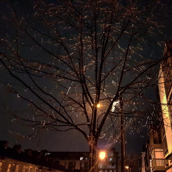 On the way back home though it had been raining and when the nude trees were backlit by the street lamps the rain droplets sparkled and instead of tree limbs, the branches looked like silvery spider webs.