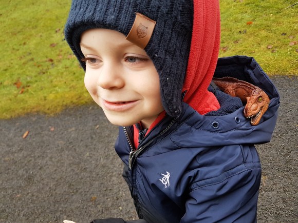 Santa brought a family of T-rexes and their cousins to Hawkeye. A bunch of fearsome looking creatures with moveable jaws. Hawkeye, of course, loves with with his entire three year old being, so one of them had to come with us on our walk. He chose the Maposaurus, which is apparently a cousin of the T-Rex with a spiky ridge on his back. Having gotten as far as the forest, however, Hawkeye no longer wanted to hold the Maposaurus, so mommy had to devise a solution to keep her hands mostly free to hold on to Hawkeye and occasionally (ok, often) take random photos. It’s far too late in the evening for a full write-up, so this will remain a mostly photographic entry. I was playing around with colours and texture and just generally goofing off with my phone camera.