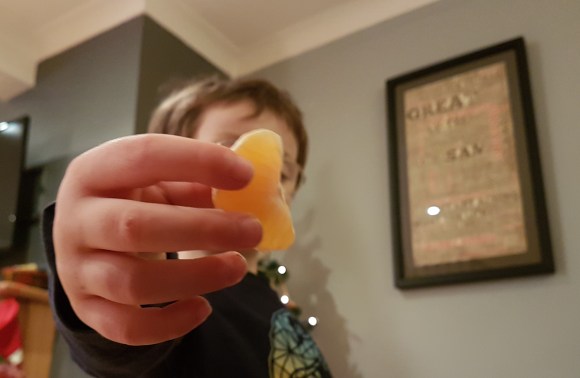 It took quite a bit of gentle cajoling to get him to try a clementine slice. I’ve tried before and he’s never gotten as far as convincing himself to take a bite. So actually getting him to put it in his mouth and chew was triumphant. Did he like it, yes he did. I knew he wood. That was never going to be my hardest hurdle. I knew he would like.