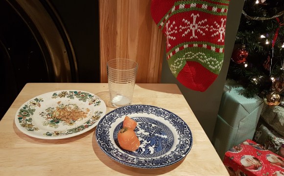 ‘Twas the night before Christmas and everything was finally ready. The gifts were all wrapped under the tree, having multiplied at the last minute and most of them suspiciously bearing the name of Hawkeye. The cookies and the milk have been set out for Santa and carrots for Rudolph. We considered leaving an actual half-eaten cookie rather than just crumbs, but there’s a not-so-insignificant chance that the cat might make off with Santa’s “left overs”. As it is, I wouldn’t put it past him to lick the plate clean. There are mince pies on the table (firmly covered, because again, our cat is a pastry fiend.) The stocking is stuffed full of Terry’s Chocolate Oranges. And Santa’s gifts are sitting by the fireplace.