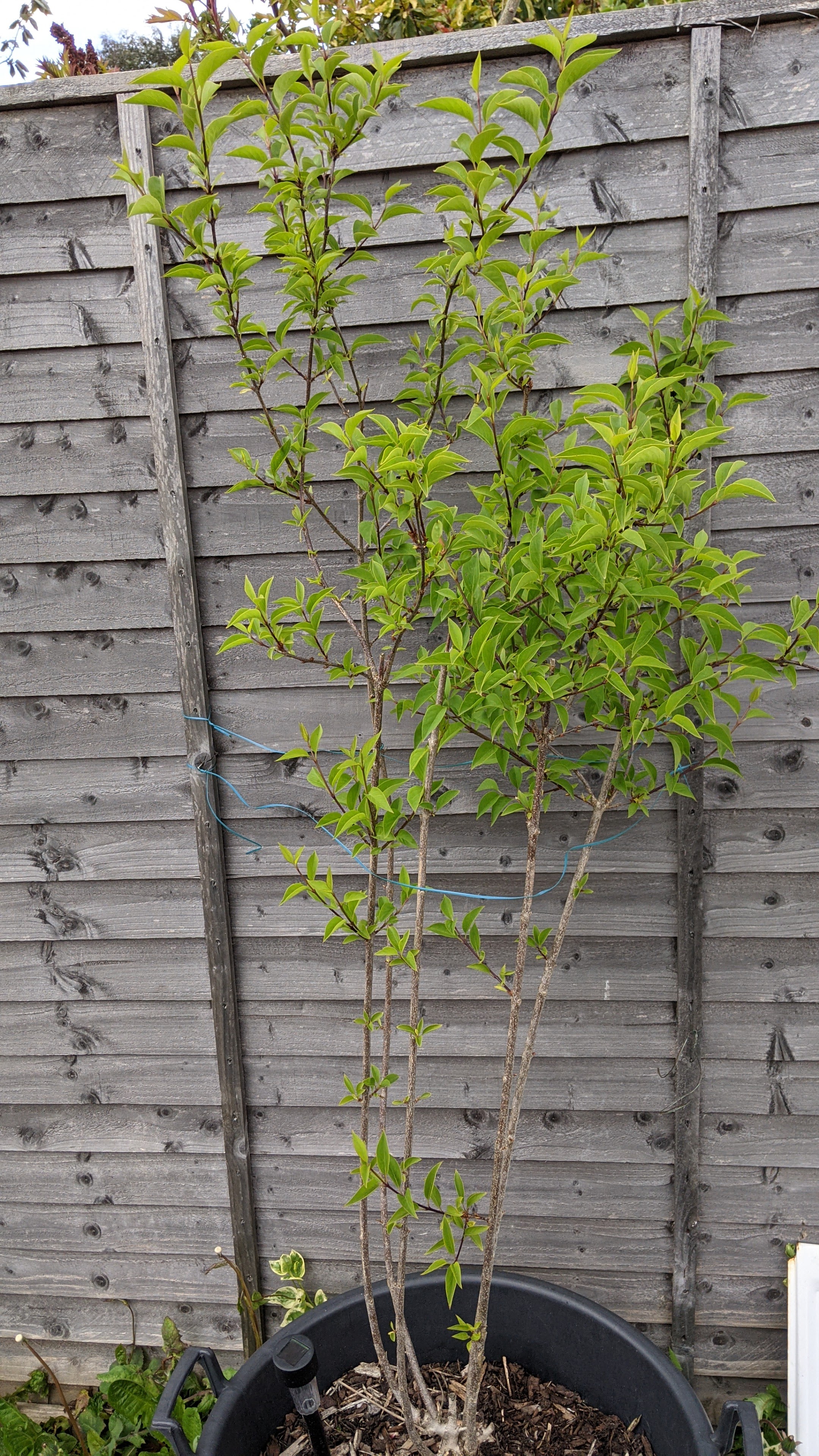 Now I wasn’t expecting the postman to come around with a fully grown 8 foot tree show up at the front door, but to be perfectly honest I didn’t really know what to expect either. What arrived, on an overcast early June day, was a somewhat sad looking sapling in a small pot. The “assed” portion of my half-assed planning was beginning to assert itself as I realised that I wasn’t actually ready to permanently plant it where I intended and my first obstacle was to find some kind of a box or pot that could accommodate a growing sapling. Thankfully, one of the neighbours that we have gotten to know over the past few years is a landscaper and came to the rescue with a giant tub-like planter and so my fit of madness was planted and maneuvered into a sunny spot by the fence where I watered it and watched it and fretted about it and then gradually got used to it.