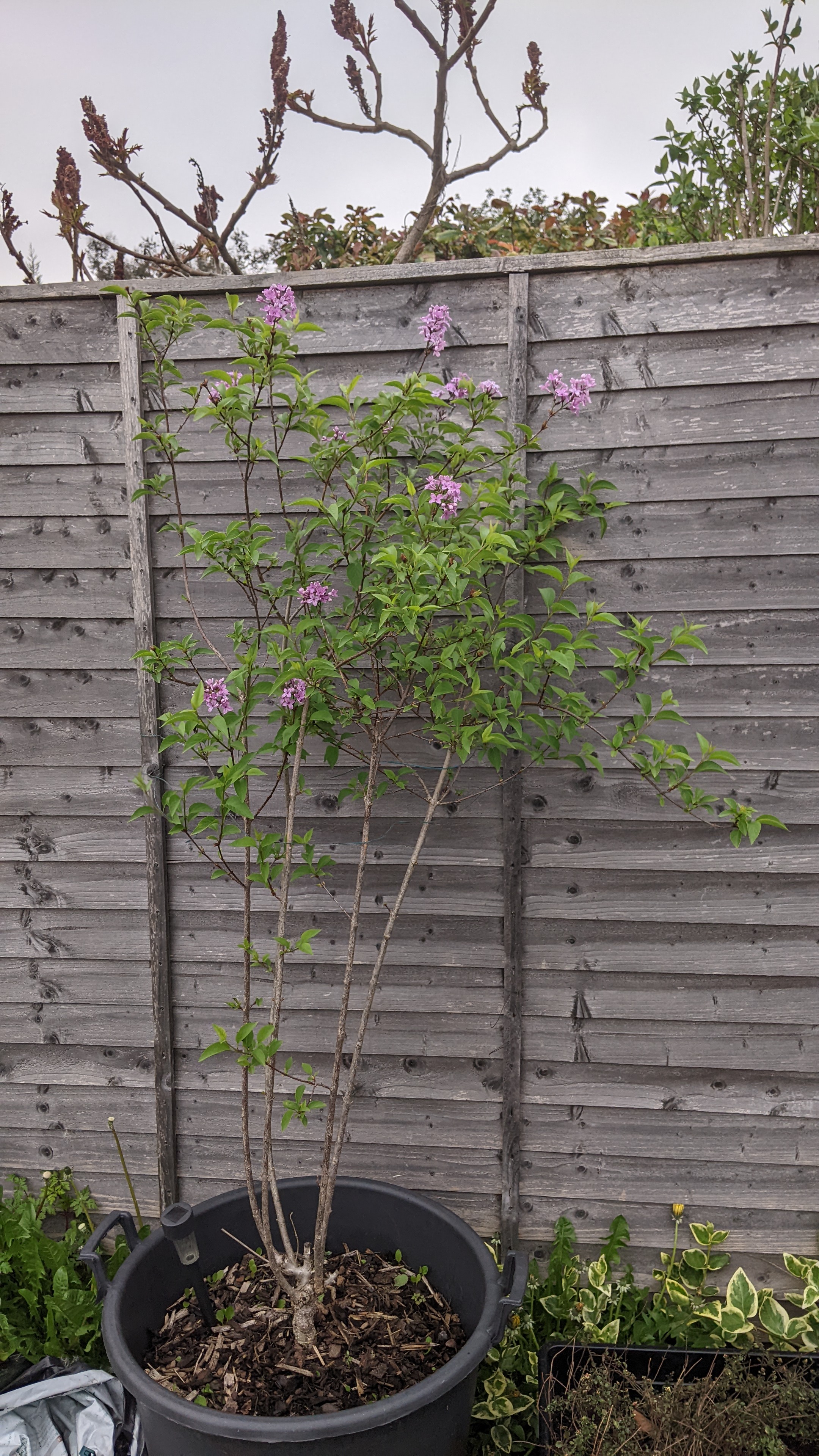 Did it survive the winter? Why yes, yes it did! I was pleasantly surprised come early April 2021 to see green shoots coming and the sapling took on a much healthier look overall as the summer progressed. However it didn’t bloom. I took comfort from further research (aka, another five minutes of googling) that young lilac trees do not necessarily bloom in the first few years until their branches are stout enough to support the flower growth, and kept watering it.